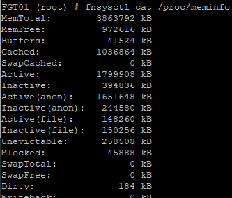 FGT-Perimeter # fnsysctl ps PID UID GID STATE CMD 1 0 0 S /bin/initXXXXXXXXXXXXXXXXXXXXXXXXXXXXXXX 2 0 0 S [kthreadd] 3 0 0 I [rcu_gp] 4 0 0 I [rcu_par_gp] 6 0 0 I [kworker/0:0H-kblockd] 8 0 0 I [mm_percpu_wq] 9 0 0 S [ksoftirqd/0] 10 0 0 I [rcu_sched] 11 0 0 I [rcu_bh] 12 0 0 S [migration/0] 13 0 0 I [kworker/0:1-events_power_efficient] 14 0 0 S [cpuhp/0] 15 0 0 S [cpuhp/1] 16 0 0 S [migration/1] 17 0 0 S [ksoftirqd/1] 19 0 0 I [kworker/1:0H-kblockd] 20 0 0 S [kdevtmpfs] 32 0 0 I [kworker/1:1-events] 37 0 0 I [kworker/1:2-mm_percpu_wq] 217 0 0 I [kworker/u4:2-fortilink] 345 0 0 S [khungtaskd] 346 0 0 S [oom_reaper] ...cut... 2019 0 0 S /bin/autod 2020 0 0 S /bin/cloudapid 2021 65530 65530 S /bin/eap_proxy 2026 0 0 S /bin/dnsproxy 2045 0 0 S /bin/wad 4 2046 0 0 S /bin/wad 5 2047 0 0 S /bin/wad 6 2048 0 0 S /bin/wad 12 2049 0 0 S /bin/wad 13 2050 0 0 S /bin/wad 14 2051 0 0 S /bin/wad 9 2052 0 0 S /bin/wad 18 0 2053 0 0 S /bin/miglogd 1 2095 0 0 S /bin/ipsengine 2096 0 0 S /bin/ipsengine 2119 0 0 S /bin/urlfilter 0 2123 65531 65531 S /bin/imi -L 2 2124 0 0 R /bin/sshd 2125 0 0 S /bin/newcli 2204 0 0 I [kworker/u4:1-events_unbound] 2319 0 0 I [kworker/u4:0-events_unbound] 2325 0 0 S /bin/httpsd