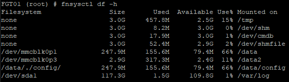 Show filesystem usage, useful when hard disks are attached to the FortiGate.